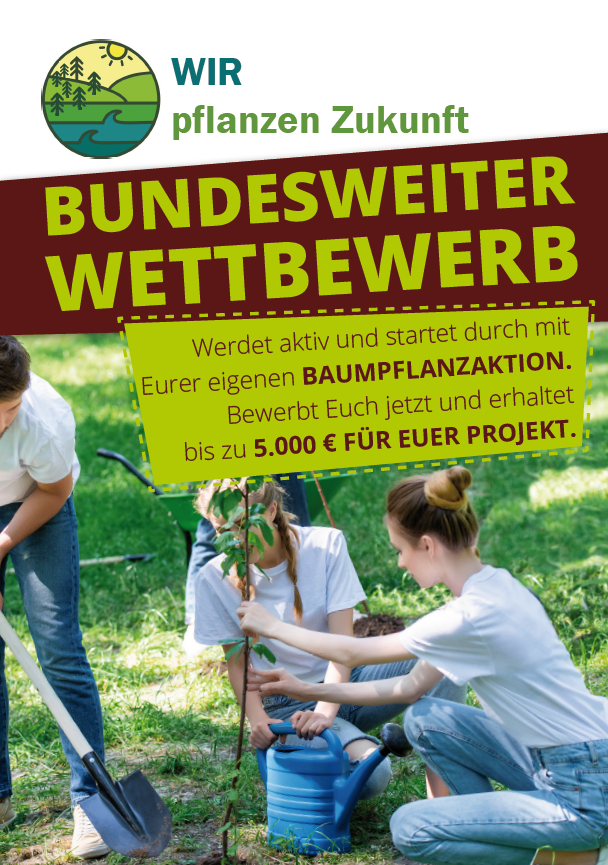 In allen Bundesländern sind nun Schüler*innen der Klassenstufen 10-13 (bzw. Jugendliche ab circa 16 Jahren) angesprochen, ein Klimabildungsprojekt (max. Förderung/Projekt 5.000,-) mit Workshops und konkreten Baumpflanzungen vor Ort mit der Schule bzw. in der eigenen Gemeinde/Stadt umzusetzen. Was dies aber genau bedeutet erfahrt Ihr am besten aus dem Flyer im Anhang oder unter: