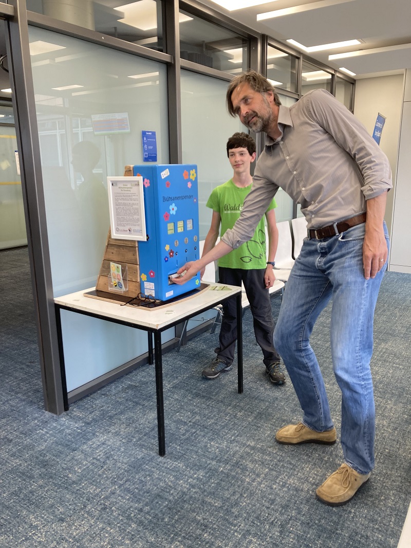Die Idee hinter diesem Standort so Jannis: “Ich rechne aktuell mit vielen Besucher*innen im Bürgerbüro der Stadt Flensburg. So kurz vor dem Sommerurlaub🚴🏄🚣☀️ fehlen vielleicht doch noch neue Reisedokumente oder andere amtliche Papiere! Da kann ja die Zeit durch das ziehen einer Blühsamenschachtel im Wartebereich etwas verkürzt werden.” 😉👍🌼