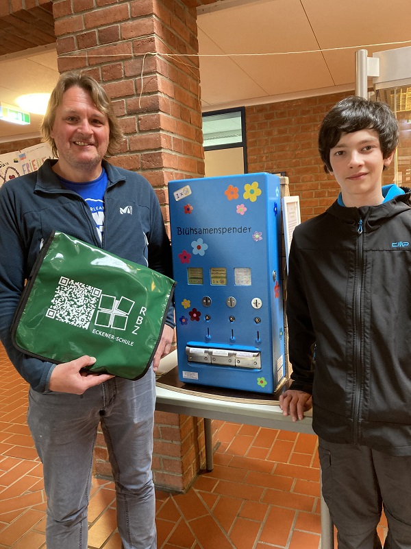 Die Ecknerschule “blüht auf!” … mit dem Blühsamenspender von Waldwuchs. Das Saatgut ist nun im Berufsbildungszentrum angekommen und kann dort ab sofort in den Pausen und Freistunden in der (Kiosk-) Halle gezogen werden. Wir sind gespannt, wie der Blühsamenautomat bei den Schüler*innen ankommt. Danke an Hannes Manzke (im Bild links), der diesen Standort ermöglicht hat. Nachdem wir uns kennenlernen konnten, sind wir nun alle auch der Meinung, diese Kooperation ist “handwerklich” ausgedrückt: ausbaufähig!