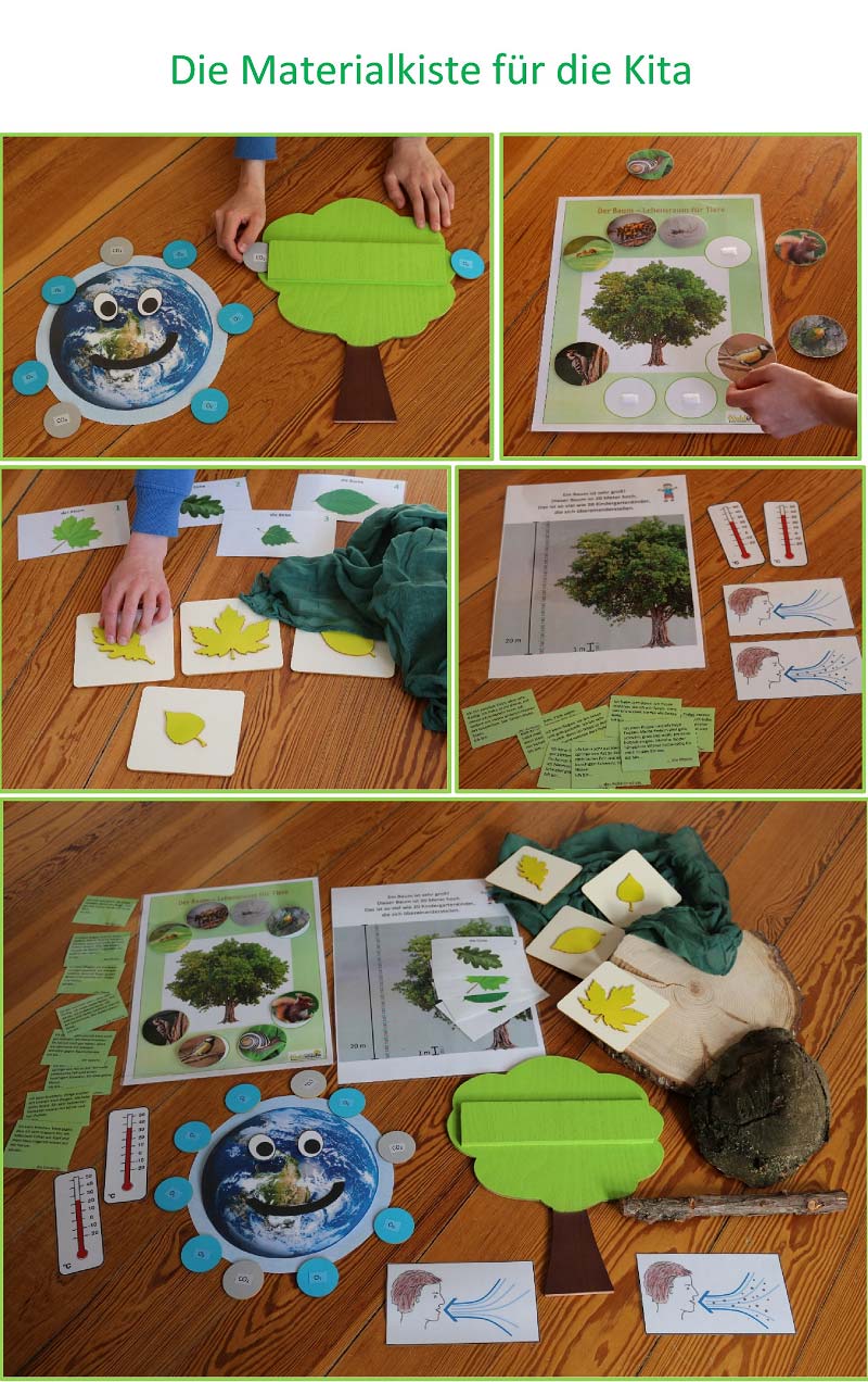 • Bereitstellung einer Materialkiste zur Gestaltung einer Projektwoche zum Thema „Baum“ für einen Zeitraum von zwei Wochen. Diese Kiste enthält ausgearbeitete, direkt einsetzbare Materialien zu 5 (kurzen) Einheiten rund um den Baum und eine Vielzahl von Erweiterungsideen. Einige Kitas planen, den Baum als „Schnullerbaum“ einzuführen. Die Kinder, die sich von ihrem Schnuller trennen wollen, können ihren letzten Schnuller symbolisch an den Baum hängen. So können die Kinder eine ganz besondere Beziehung zu „ihrem“ Baum aufbauen.