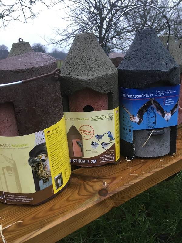 Wir haben auf unserer Arboretumsfläche 12 Nistkästen für verschiedenste Vogel- und Fledermausarten angebracht. In erster Linie für Höhlenbrüter, die auf alte Bäume angewiesen sind und heutzutage diese kaum noch vorfinden. Auf ca. 2-3 m Höhe betreiben wir nun “sozialen Wohnungsbau”. Nicht nur im Frühjahr werden die Nistkästen genutzt, sondern auch im Winter schützen sich Schmetterlinge, Bilche, Kleiber und Meisen vor frostigen Temperaturen oder überwintern gleich dort. Vögel sind ein wichtiger Bestandteil im Beziehungsgeflecht einer Streuobstwiese. Sie regulieren Schadinsekten und stellen zugleich eine Nahrungsquelle für Prädatoren (Räuber, Beutegreifer, Fressfeinde) da.