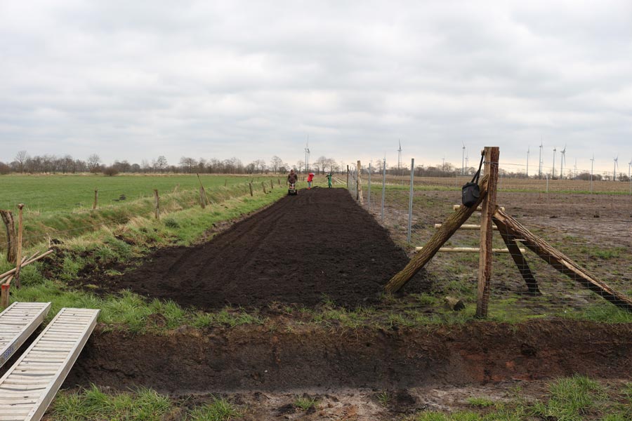 Nicht jede Fläche eignet sich zum Pflanzen von Bäumen, kann aber dennoch ökologisch sinnvoll genutzt werden. Ein gut 200 m² großer Streifen der Waldwuchsprojektfläche der Familie Ide in Goldebek musste an der Nordseite wegen des Flutgrabens „baumfrei“ gehalten werden. Dieser Streifen soll nun aufblühen: Im März haben wir gemeinsam mit der Baumschule Ceban den Boden gepflügt, von Grassoden befreit und geharkt. Anschließend wurde der Samen ausgebracht: eine Blütenmeer-Saummischung der Blütenmeer-GmbH, die reichlich regionale Kräuter enthält. Heimische Wildbienen und andere Insekten sollen dort zukünftig reichlich Nahrung finden. Damit sich die Insekten richtig wohl fühlen, haben wir ein 120cm x 100cm großes freistehendes Bienen- und Insektenhotel aufgestellt. Zwischen Holunderbüschen bietet es reichlich Platz für den Erstbezug und ist selbstverständlich provisions- und courtagefrei 😊.
